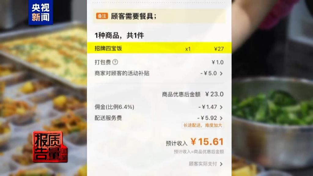 她在后台系统随机挑选了一笔外卖订单,现场算了一笔账:该订单中招牌四宝饭的售价为27元,打包费1元,总共是28元,减去商家对顾客的活动补贴5元、平台佣金1.47元以及配送服务费5.92元后,预计收入为15.61元。这笔预计收入减去食材成本后,所剩寥寥无几。